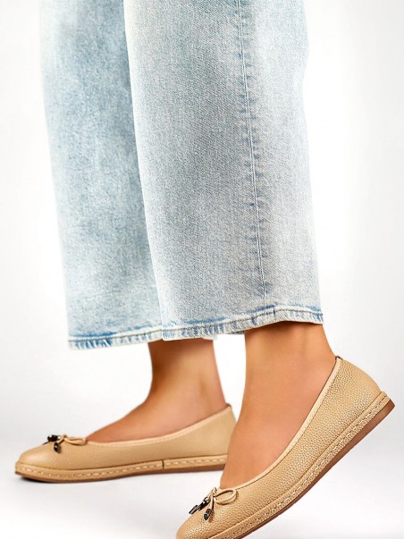 Ces ballerines beiges pour femme, fabriquées en cuir écologique, sont idéales à porter tout au long de l'année. Grâce à la coupe à enfiler, elles sont confortables et faciles à porter, tout en offrant un look élégant et classique. La semelle intérieure en cuir naturel garantit confort et respirabilité pendant le port. Les ballerines ont un bout rond, ce qui souligne leur caractère subtil et polyvalent, idéal pour de nombreuses occasions, que ce soit pour le quotidien ou pour le travail.