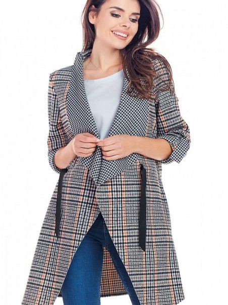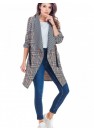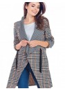 Élégante veste à carreaux disponible en deux couleurs : bleu marine et beige. Des appliques décoratives sur les manches vous permettent de régler leur longueur. Il a des poches et peut être noué à la taille. Le produit a été conçu et fabriqué en Pologne.