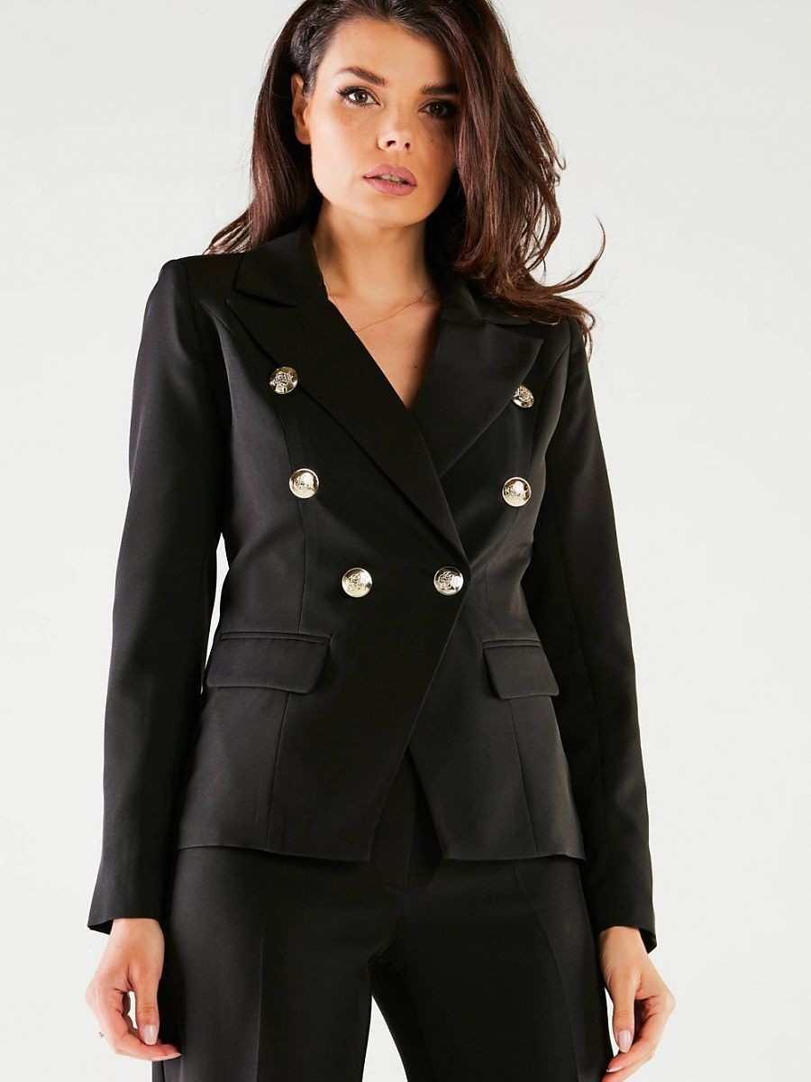 Veste légèrement ajustée, à double boutonnage et à larges revers. Fermé par de gros boutons dorés, qui décorent également le bas des manches. Parfait pour tous les jours, le travail et de nombreuses autres stylisations décontractées. Fabriqué et conçu en Pologne.