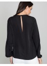 Blouse avec un motif intéressant à l'encolure, a des manches longues avec une bande élastique. Blouse à coupe droite avec une fente spectaculaire dans le dos. Un excellent choix avec un pantalon ou une jupe.