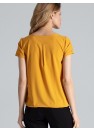 Chemisier à manches courtes avec un décolleté en forme de cœur. Surpiqûres à l'épaule avec plis décoratifs. La manche se termine par un poignet retroussé. Côtés avec une fente en bas, finis avec une surpiqûre semi-circulaire.