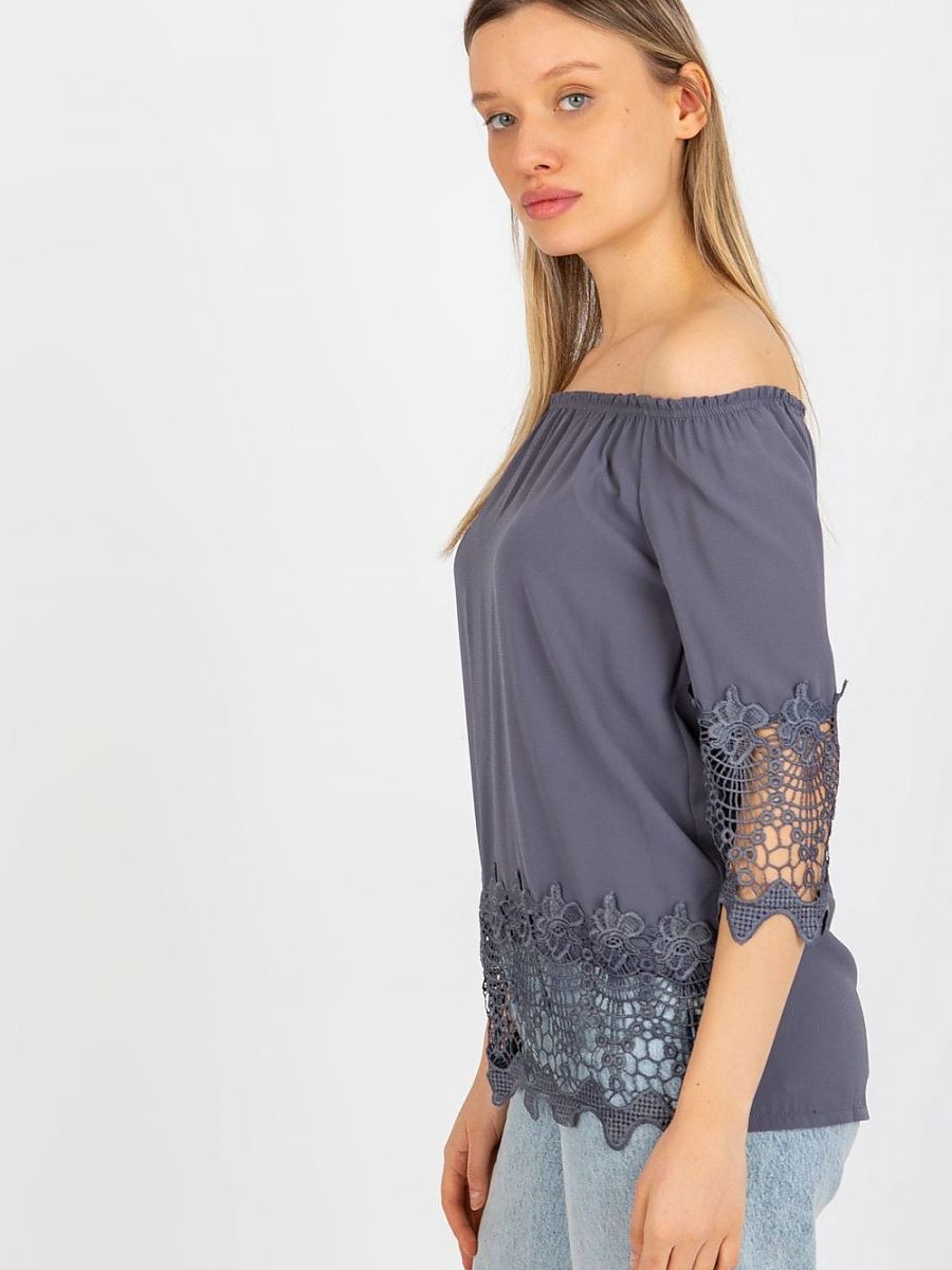 Chemisier avec manches 3/4 et encolure de style espagnol. Les manches et l'ourlet de la blouse sont ornés d'une bordure décorative.