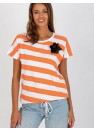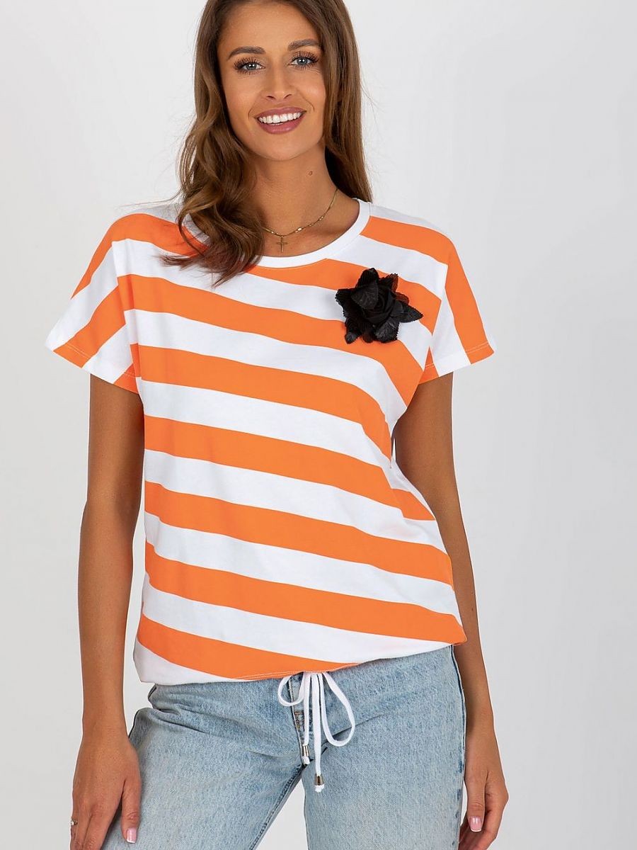 Chemisier pour dames à manches courtes et encolure ronde à rayures colorées. Broche décorative en forme de fleur sur le devant.