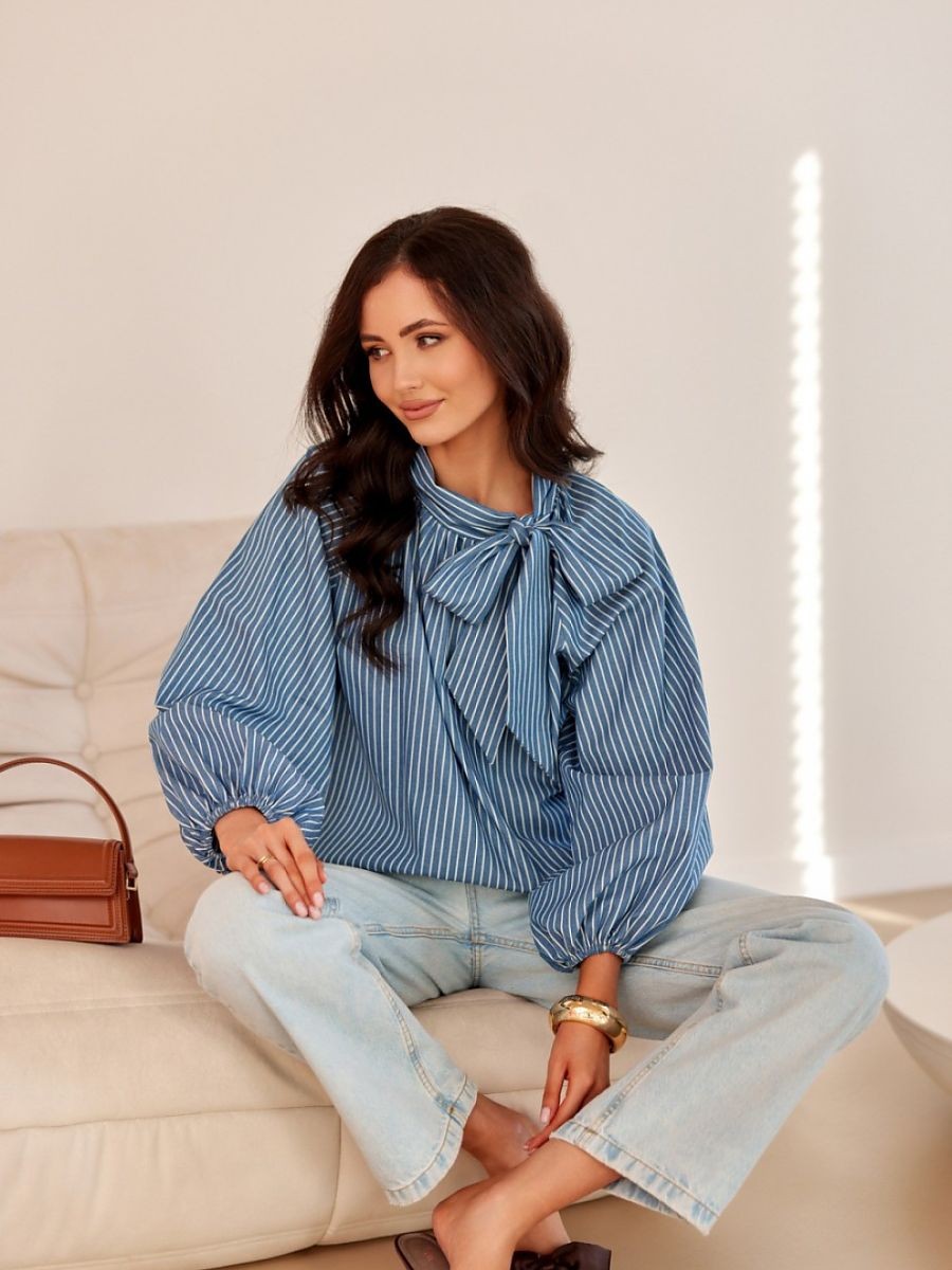 Chemisier à manches longues et bouffantes avec élastique cousu. Il a un joli nœud décoratif au décolleté.