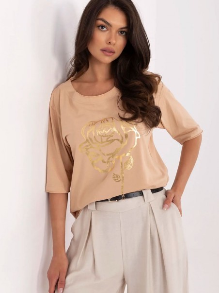 Chemisier décontracté pour femme idéal pour les tenues quotidiennes. Fabriqué dans un mélange de coton et d'élasthanne agréable au toucher, il assure un confort de port et un ajustement parfait à la silhouette. Le chemisier a une longueur standard, des manches courtes et un col rond classique qui conviendra à de nombreuses associations universelles. L'élément dominant est l'imprimé subtil en forme de rose, qui ajoute un charme féminin et une élégance délicate à l'ensemble. Un excellent choix pour les femmes qui apprécient le confort associé à une touche tendance dans leur tenue quotidienne.