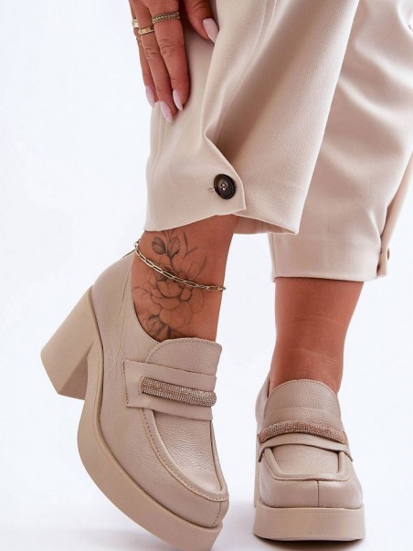 Semi-bottes à talons pour femmes, dont la tige est en cuir naturel. L'intérieur est également recouvert de cuir naturel, ce qui les rend très agréables à porter. Un ornement brillant se trouve sur le devant. Un talon élégant en forme d'aiguille large assure la stabilité à chaque pas. Le contrefort du talon est rembourré. De plus, un cordon sous la languette permet à la chaussure de s'adapter parfaitement à votre pied.