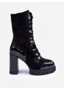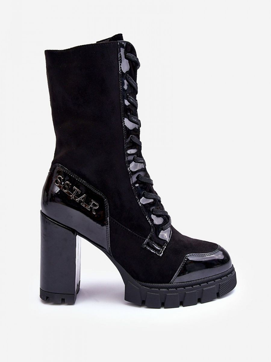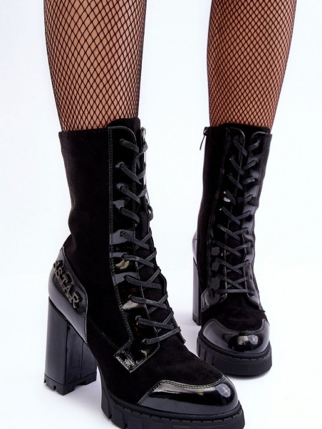 Bottes pour femmes fabriquées à partir d'une combinaison de cuir écologique et de daim écologique. Fermeture à glissière à l'intérieur de la tige. Laçage sur le devant. Talon en forme de talon aiguille. Modèle à tige plus haute. Centre doublé d'une couverture pour chaussures. En outre, le talon est renforcé.