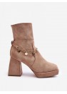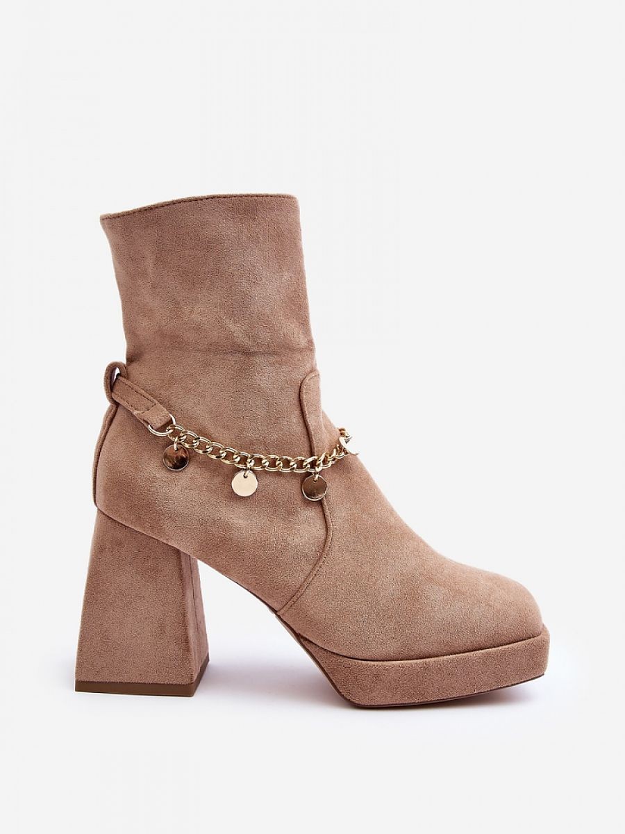 Ces bottes pour femmes ont été fabriquées en éco-suède pour un look élégant. Elles sont dotées d'un talon bloc robuste et d'orteils de forme carrée, qui apportent une touche de modernité. Le contrefort du talon raidi assure la stabilité et le confort pendant l'utilisation. La tige est ornée d'une chaîne. Ces bottes seront le complément parfait de votre style d'automne !