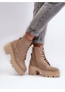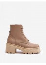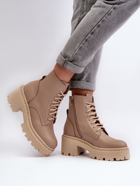 Bottes pour femmes en cuir naturel. Montées sur un talon massif et une semelle épaisse. Bout arrondi. Ce modèle se ferme à l'aide d'une fermeture à glissière et comporte en outre un laçage. Tige à longueur de cheville. Contrefort de talon renforcé.