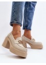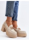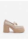 Demi-chaussure à talon pour femme avec une tige en cuir naturel. Montées sur une semelle épaisse et un talon en forme de poteau massif. Ce modèle a un nez arrondi. La semelle intérieure en cuir assure le confort d'utilisation. Bride et décoration sur le devant.