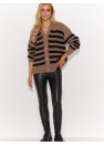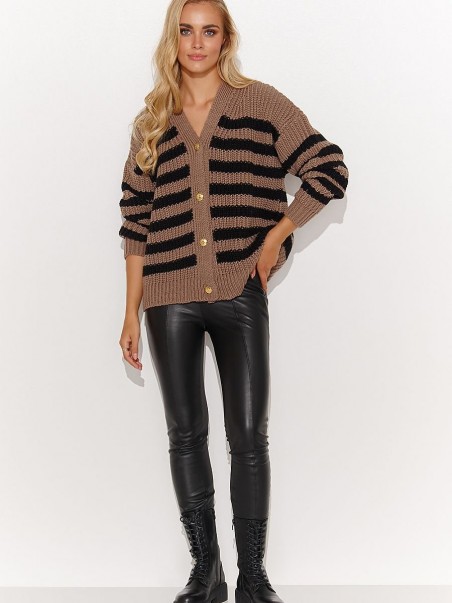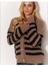 Ce pull-over cardigan pour femmes est un incontournable de votre garde-robe. Fermé par des boutons dorés, il est d'une élégance exceptionnelle. Il est doté de manches longues et d'une taille basse, et son encolure en V met en valeur les clavicules, ce qui lui confère un charme féminin. Le motif frappant du pull est constitué de rayures épaisses aux couleurs contrastées, disponibles en deux versions : écru et noir, et cappuccino et noir. Choisissez celle qui correspond le mieux à votre style. Les manches sont terminées par un ourlet côtelé pour une coupe confortable. La coupe ample du pull garantit une grande liberté de mouvement et un grand confort. C'est le choix idéal pour les jours plus froids. Portez-le comme vous le souhaitez, avec un pantalon ou sur une élégante robe en maille. Quelle que soit la version choisie, elle vous ira à ravir !