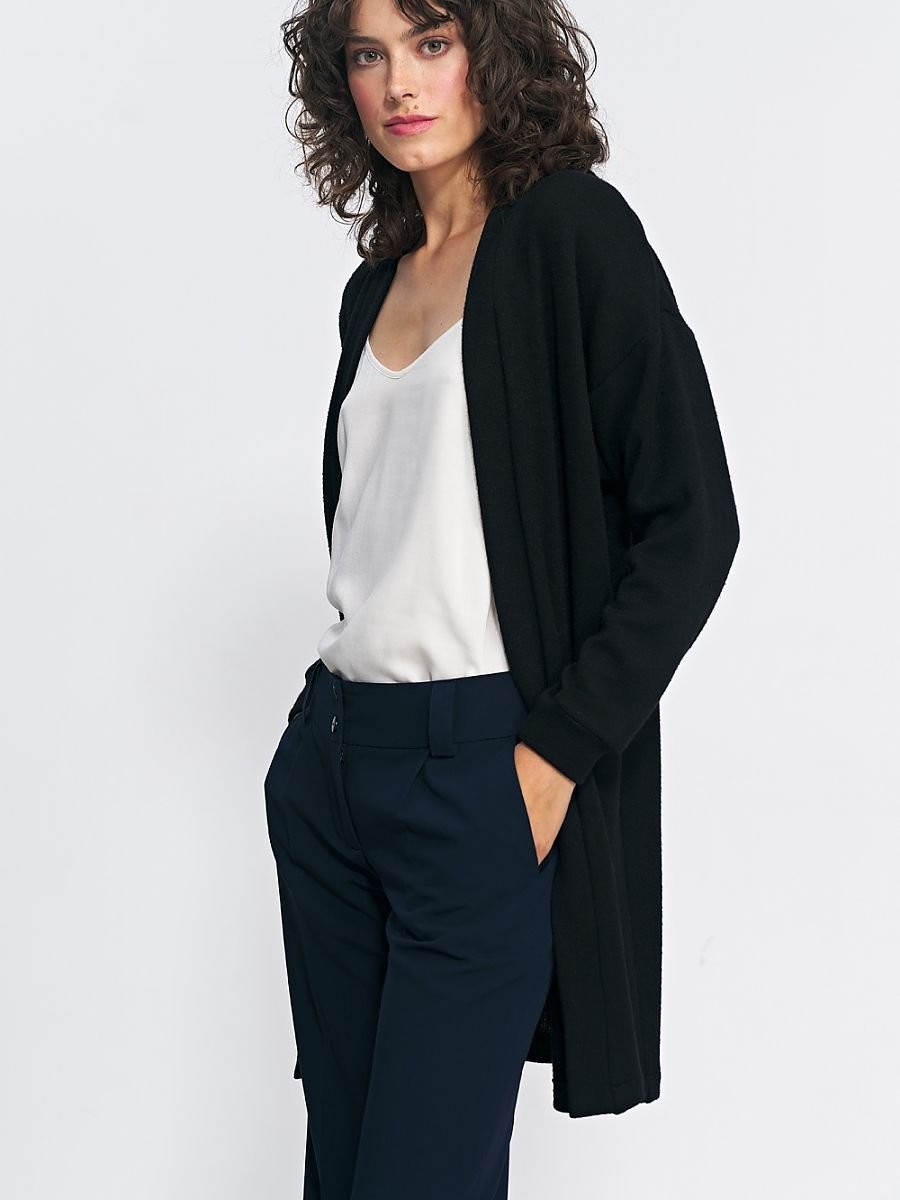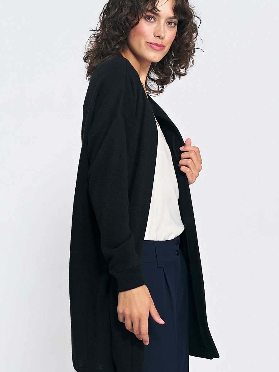 Cardigan noir déboutonné en maille agréable et douce. Il sera parfait comme vêtement extérieur chaud pour des tenues de week-end confortables avec des leggings ou des pantalons en maille. Il peut être porté ample ou accentuer la taille à l'aide d'une ceinture décorative. Ceinture non incluse.