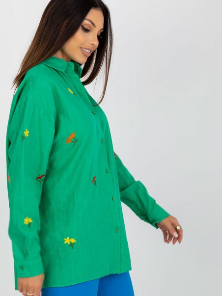 Chemise boutonnée à manches longues pour femmes. La chemise est ornée de fleurs colorées brodées.