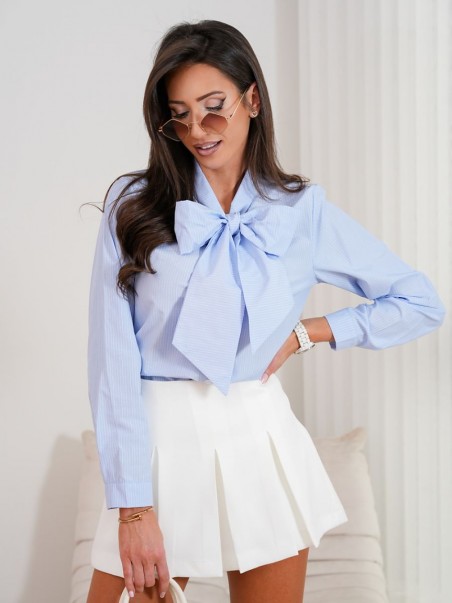 Chemise pour femme à manches longues est une proposition élégante et intemporelle, qui conviendra aussi bien au bureau qu'à des sorties plus décontractées. Fabriquée dans un matériau délicat de couleur bleu clair subtile, elle assure un confort toute la journée. La chemise se ferme par des boutons et le nœud décoratif au cou lui donne un caractère unique et une élégance subtile. Elle se marie parfaitement avec des pantalons classiques, une jupe ou un jean, créant de nombreux ensembles élégants et féminins. Parfait pour être porté au quotidien, ainsi que pour des occasions plus formelles.