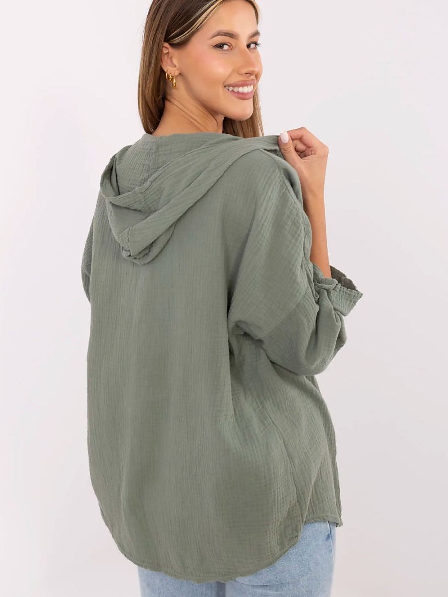 Chemise décontractée en mousseline de coton pour femme est le choix idéal pour les tenues quotidiennes. Le tissu léger, aéré et doux au toucher assure le confort toute la journée, même par temps plus chaud. La texture lisse du matériau et la coupe classique rendent la chemise polyvalente et facile à styliser. Modèle de longueur standard, boutonné, avec une capuche pratique qui ajoute un caractère sportif et décontracté. Les manches peuvent être retroussées pour ajuster la longueur en fonction de la météo et du style. Des détails supplémentaires tels que des patchs et une poche à la poitrine donnent à la chemise un aspect original et un accent streetwear léger. Une excellente proposition pour un usage quotidien avec des jeans, des shorts ou des leggings. Parfait pour les femmes qui apprécient le confort et le style en un seul.