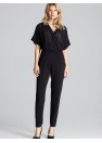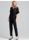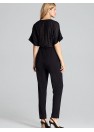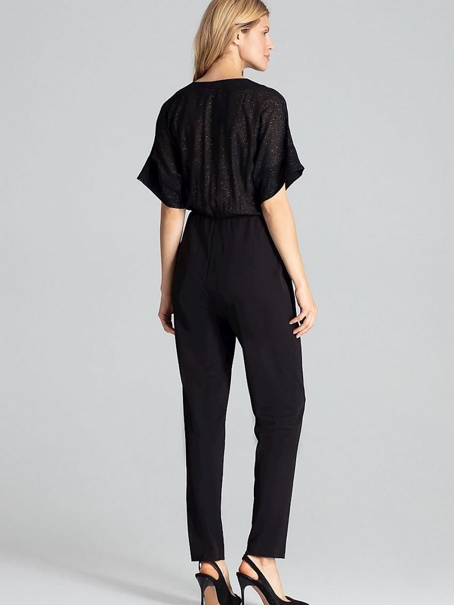Combinaison élégante noire. Haut en brocart avec manches courtes tombantes, encolure enveloppante, taille plissée avec bande élastique cousue, pas de poches, jambes légèrement fuselées en bas.