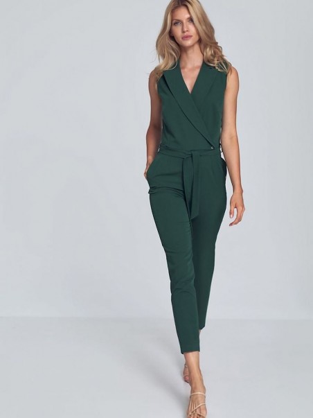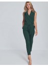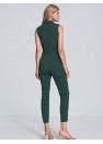Body vert sans manches à col en V, avec un col, un lien à la taille et des jambes amples et fuselées. Fermeture à la taille devant avec un bouton-pression extérieur et intérieur et une fermeture éclair couverte. Poches sur les coutures latérales.