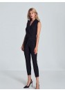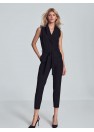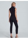 Combinaison noire à col en V, sans manches, nouée à la taille, jambes amples et effilées vers le bas. Fermeture à l'avant, à la taille, avec un bouton-pression extérieur et un bouton-pression intérieur et une fermeture éclair couverte. Poches sur les coutures latérales.