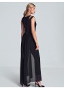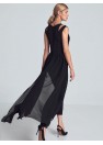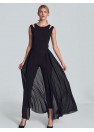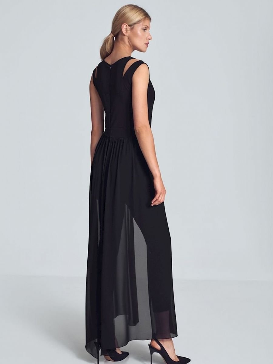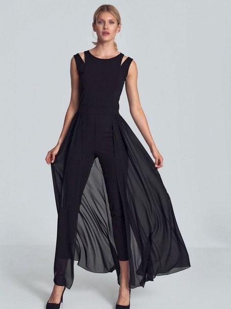 Combinaison noire avec une longue jupe en mousseline fendue dans le dos. Sans manches, avec de délicates fentes décoratives aux épaules et un petit décolleté en demi-cercle. Pieds effilés en bas. Fermeture à l'arrière avec un long zip couvert.