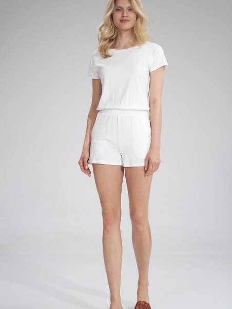 Combinaison d'été à jambes courtes avec des poches, une encolure semi-circulaire, des manches courtes, une large taille élastique.