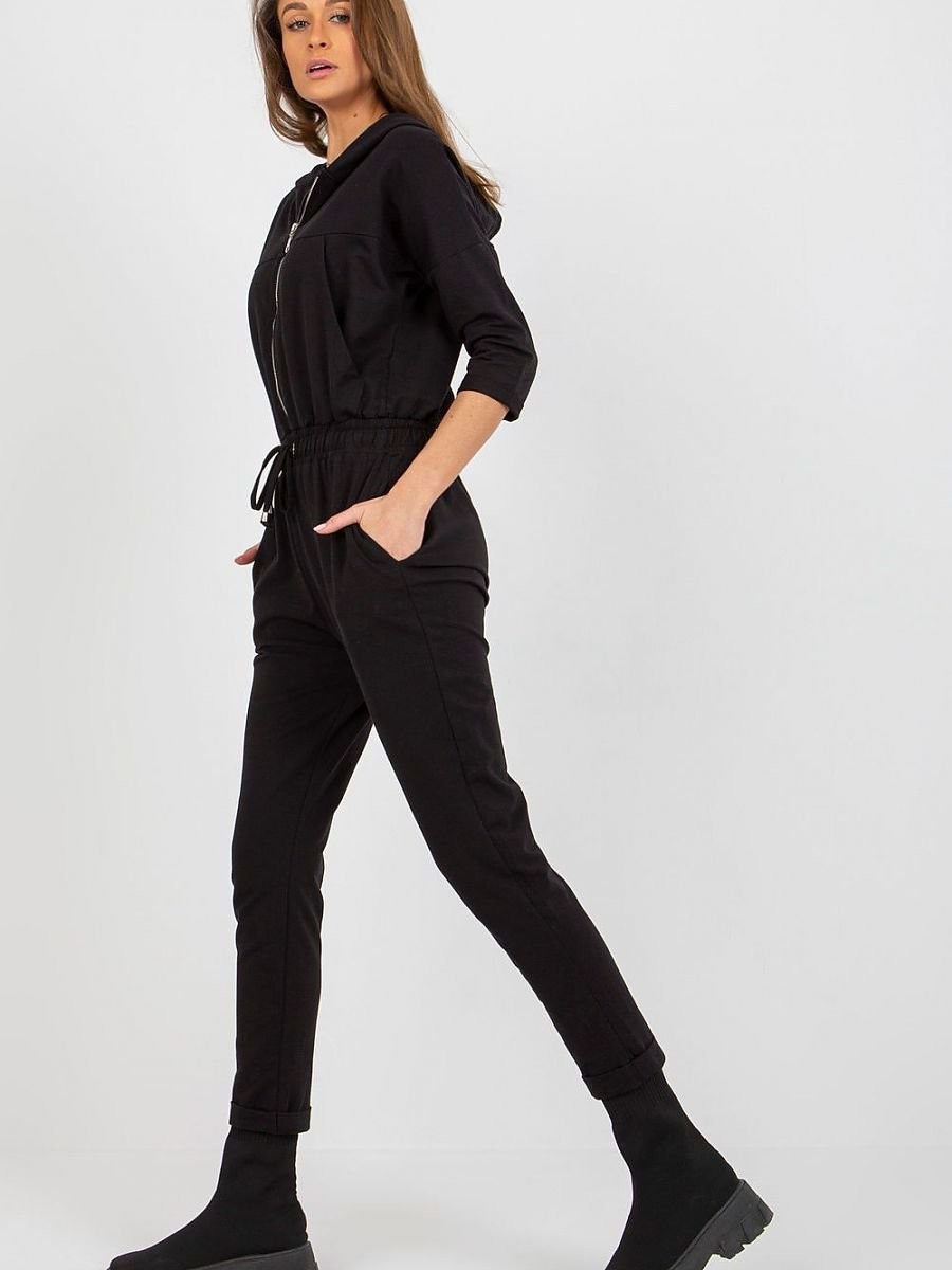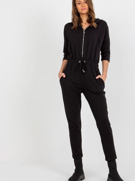 Combinaison pour femme avec manches 3/4 et capuche. Combinaison zippée avec des liens. Poches à glisser sur les côtés.