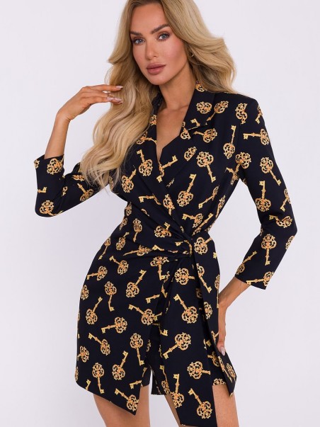 Cette combinaison courte pour femme, en tissu imprimé, allie élégance et confort. Le haut de la combinaison est doté d'un col veston pour une touche chic, tandis que le devant vestonné dissimule astucieusement le short pour créer une silhouette harmonieuse et galbée. Un lien sur le côté ajoute une touche unique à la combinaison et permet d'ajuster la coupe. Une fermeture éclair couverte est cousue au centre pour un enfilage confortable. Le costume a été conçu et cousu en Pologne, avec le souci du détail et la plus haute qualité de fabrication.