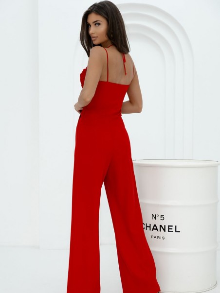 Combinaison pour femme à fines bretelles, fermée par une fermeture éclair dissimulée. À l'avant, des plis décoratifs, cintrée à la taille, avec des poches insérées sur les côtés. Parfait pour de nombreuses occasions.