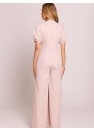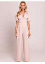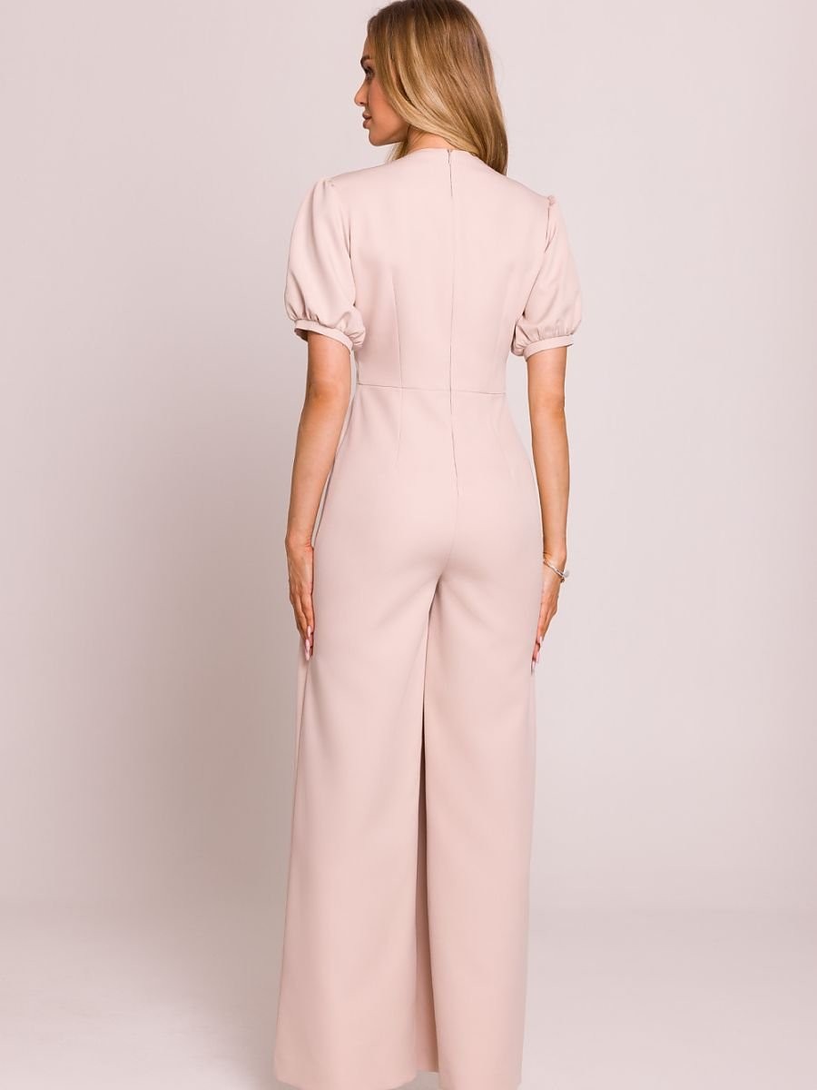 Combinaison élégante de coupe féminine, fabriquée dans un tissu de haute qualité. Le profond décolleté en V met joliment en valeur le cou et le décolleté, tandis que la taille soulignée met en valeur la silhouette. Les manches courtes bouffantes avec des poignets ajoutent une touche romantique, et les jambes légèrement évasées avec des plis depuis la taille assurent un look élégant et décontracté. Modèle fermé par une fermeture éclair dissimulée à l'arrière, avec le haut doublé pour un plus grand confort. Conçu et fabriqué en Pologne avec un souci du détail.