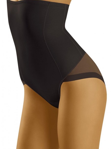 Culotte taille haute modelante et amincissante. Fabriquées en tissu serrant, elles galbent parfaitement la silhouette, éliminant optiquement les imperfections de la silhouette. L'avantage réside dans les longues coutures verticales, qui affinent davantage la silhouette féminine. Le dos est fait de maille qui soulève les fesses. La culotte est terminée par une bande de silicone qui empêche le glissement.
