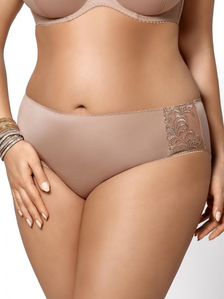 Classique, slip complet en microfibre lisse. Sur le côté, insertion de belles broderies sur maille. Les jambes et le dos sont terminés par un délicat élastique.