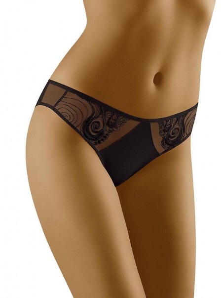 Des culottes féminines. - hausse légèrement faible - entièrement en microfibre lisse - façade décorée de broderies sur maille - dos lisse - insert en maille en haut du dos avec une reliure décorative - culotte finie avec une couture plate