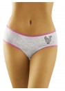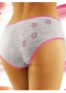 Mignonne culotte en coton avec l'impression d'un chat femelle qui se pavane. Sur le dos, sur les fesses, il y a des pattes de chat... Couleur grise douce avec un passepoil rose.