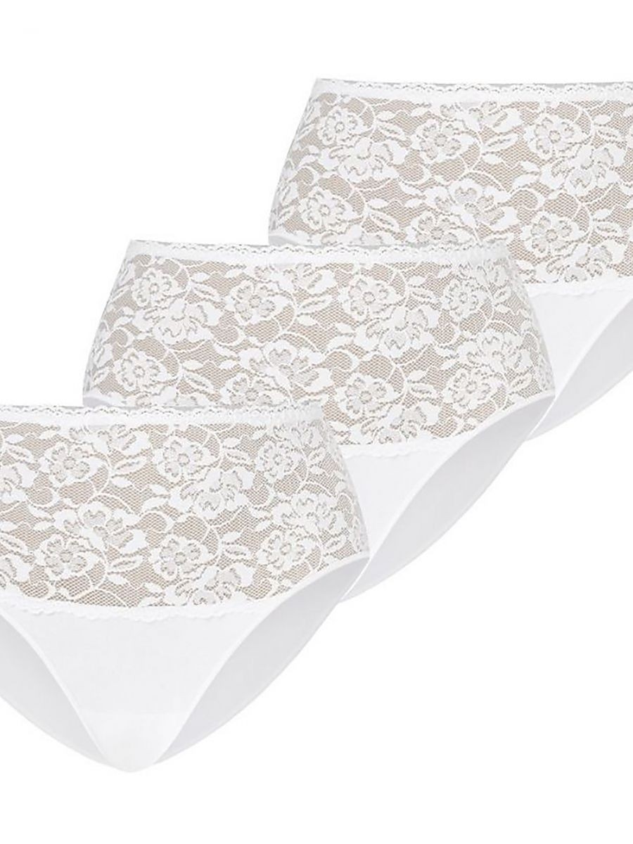 Un ensemble de culottes pour femmes en blanc. Les culottes de l'ensemble ont une taille haute, atteignent le nombril et masquent les défauts de la silhouette. L'avant de la culotte est décoré d'une dentelle élastique à motifs, l'arrière de la culotte est plus haut, couvrant les fesses, et se termine par une fine bande élastique autour des cuisses. Le pack de trois culottes est très populaire auprès des clientes car le prix est attractif.