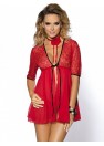Chemise de nuit rouge nouée sur le devant, au niveau de la poitrine. Manches 3/4 avec une bordure contrastée noire, la même que celle qui orne l'encolure. Le haut en dentelle est élégant et sensuel, et le bas léger et aéré cachera des hanches plus larges et mettra en valeur votre look sexy. String inclus. Fleur autour du cou non incluse.