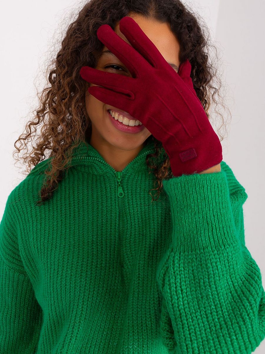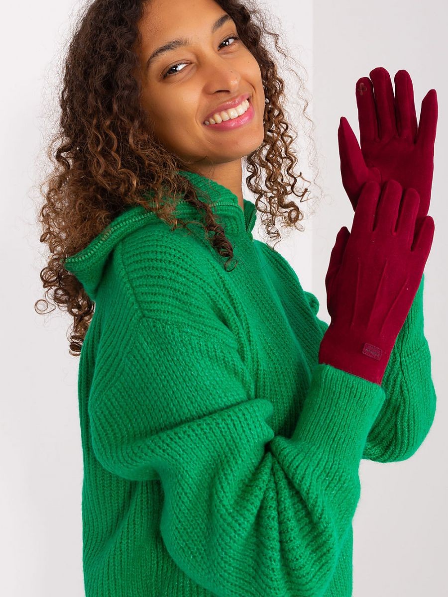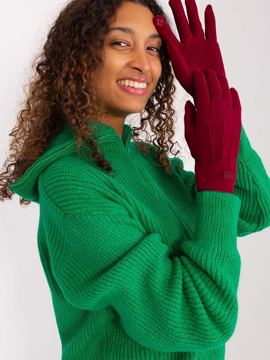 Gants élégants pour femmes en tissu lisse et isolé. Patchs décoratifs aux poignets. L'index est orné d'une fleur brodée, ce qui vous permet d'utiliser votre téléphone sans enlever les gants.