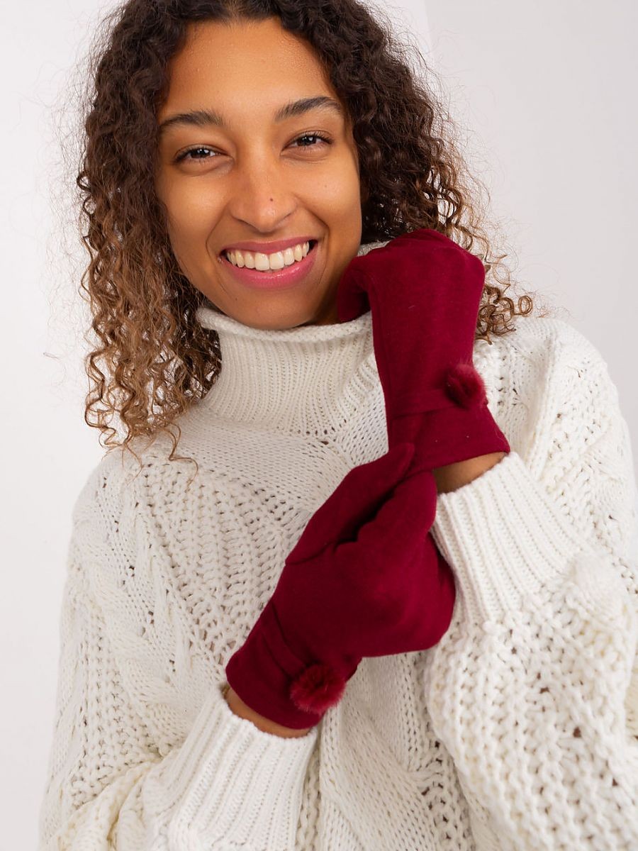 Élégants gants tricotés pour femmes en tissu lisse. Pompons décoratifs aux poignets. Index avec fleur brodée, permettant d'utiliser son téléphone sans avoir à retirer les gants.