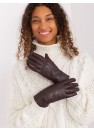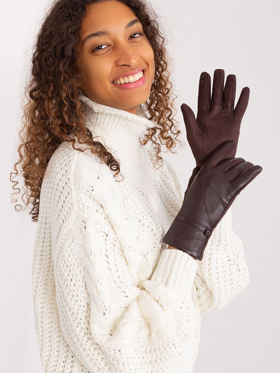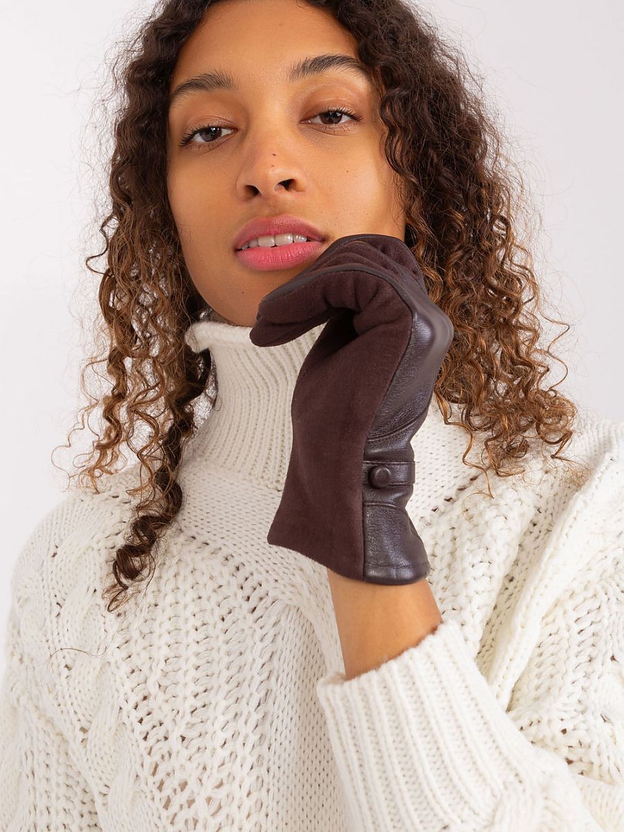 Gants élégants pour femmes, fabriqués à partir d'une combinaison de deux matériaux différents. Bretelles décoratives avec boutons aux poignets. L'index est orné d'une fleur brodée, ce qui permet d'utiliser le téléphone sans avoir à retirer les gants.