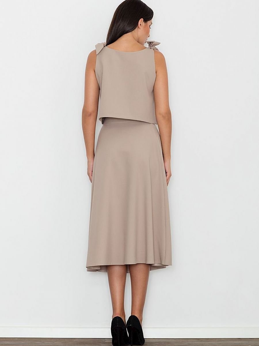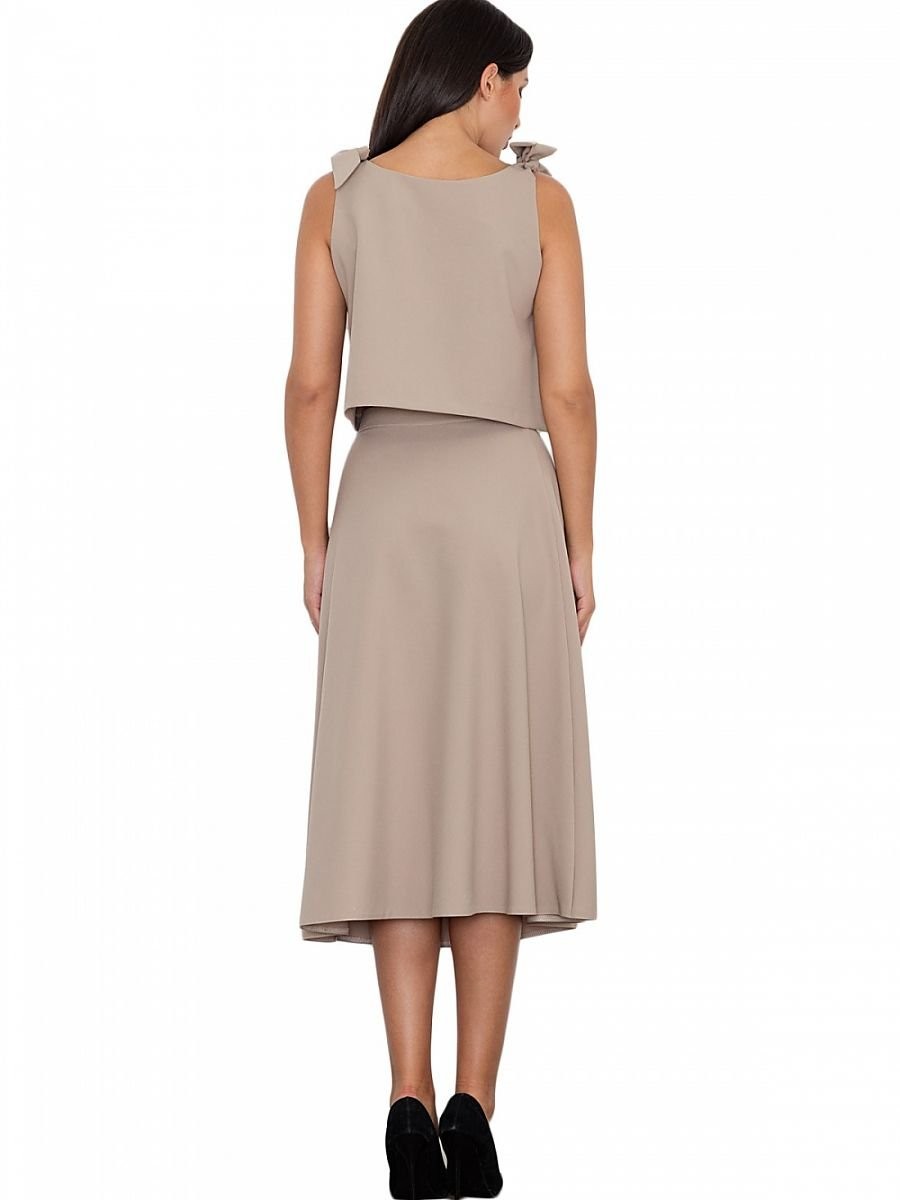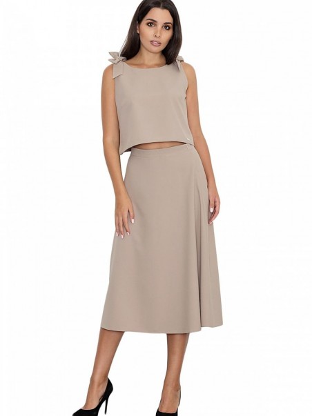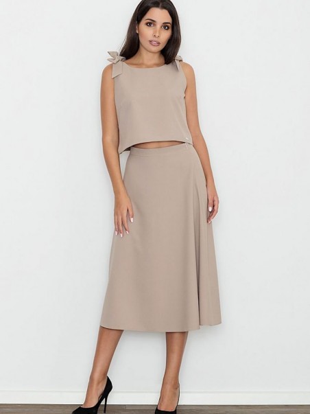 Un ensemble élégant avec une jupe. La grande coupe de la jupe ajoute au confort quotidien. Droit, évasé à mi-mollet, avec une fermeture éclair dissimulée au dos. Top ample avec nœuds décoratifs, noué aux épaules. Le tout pour ceux qui aiment avoir un look à la mode et moderne.