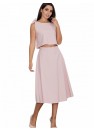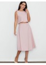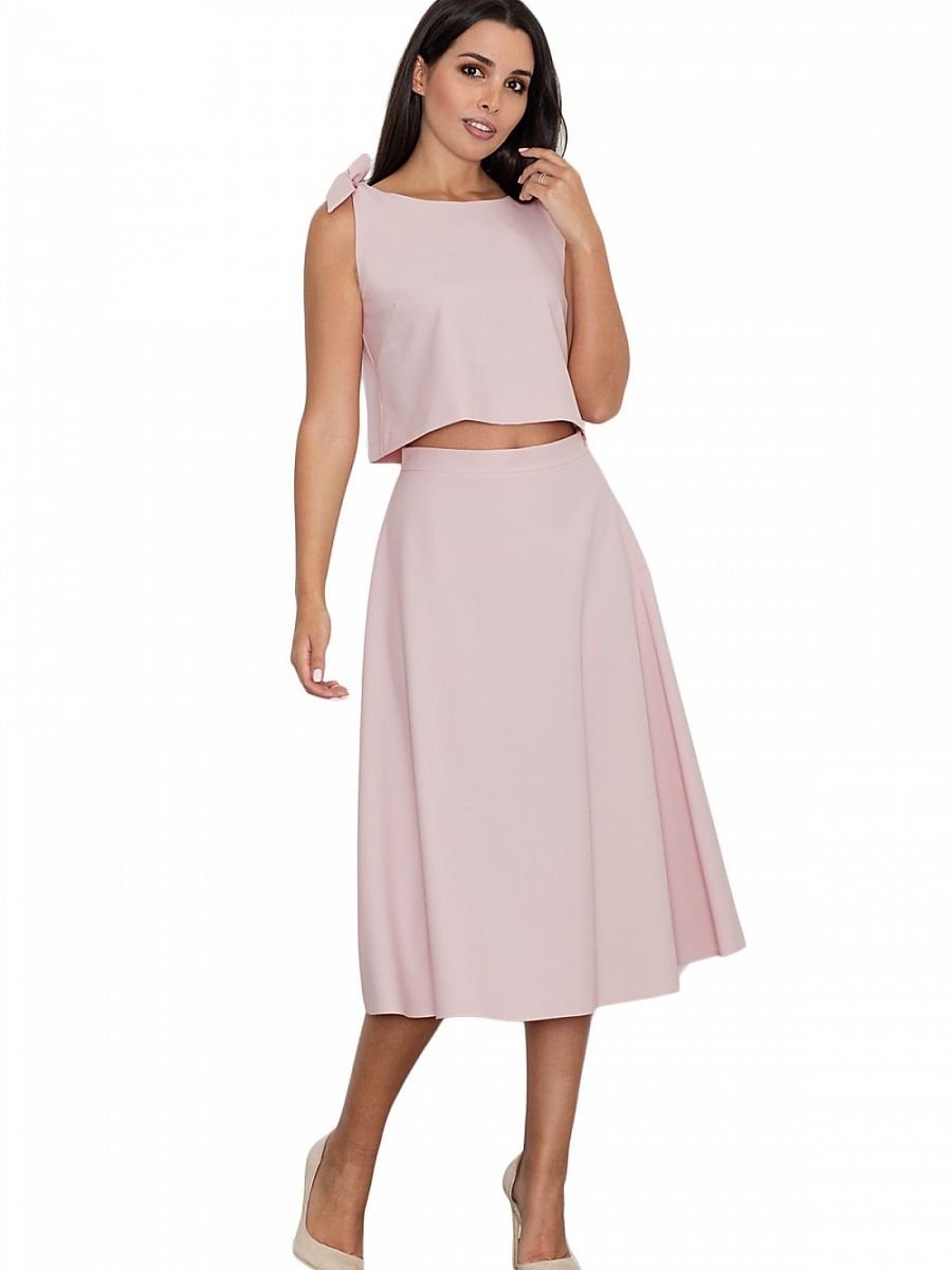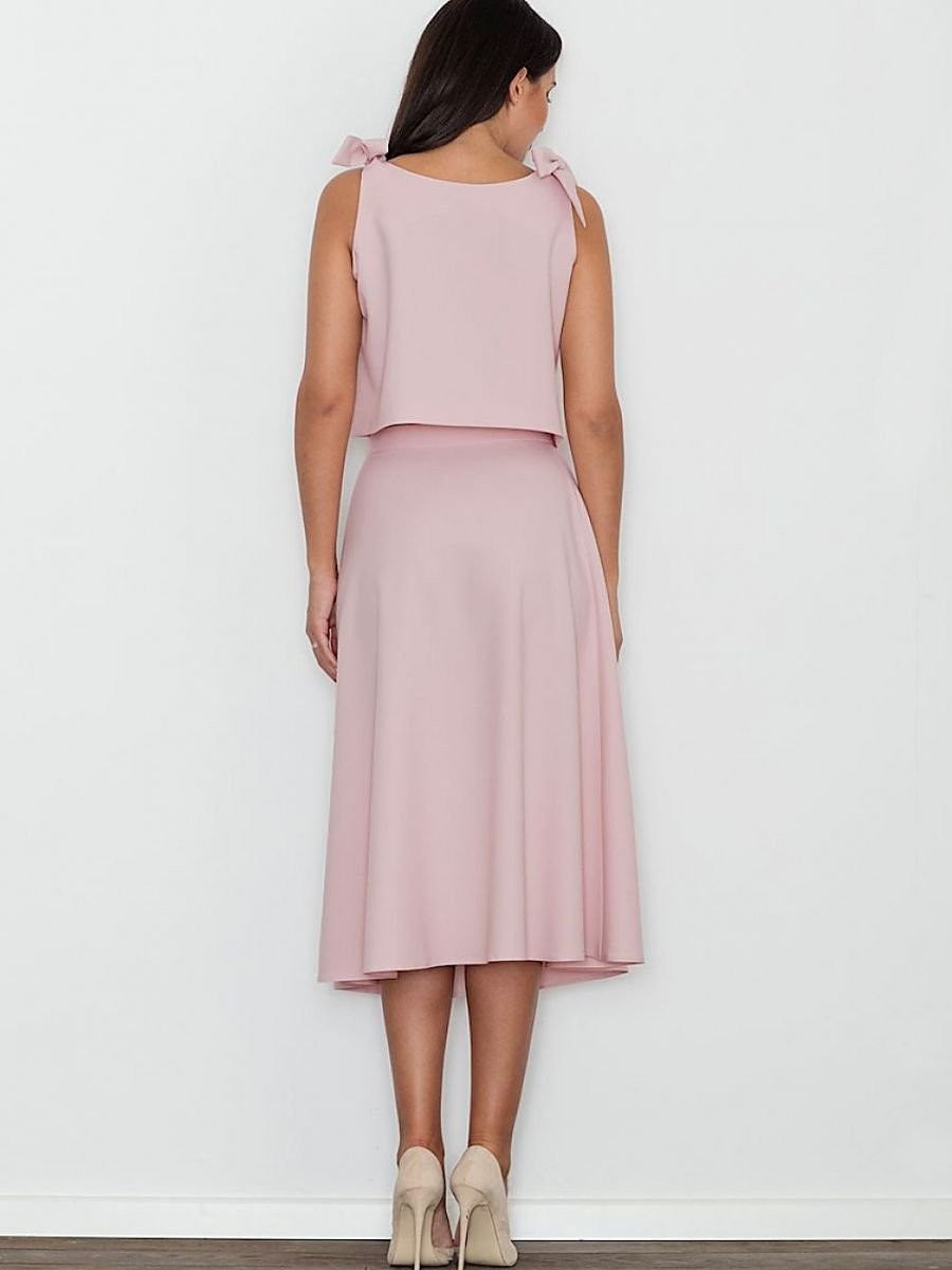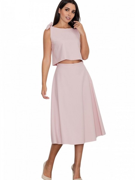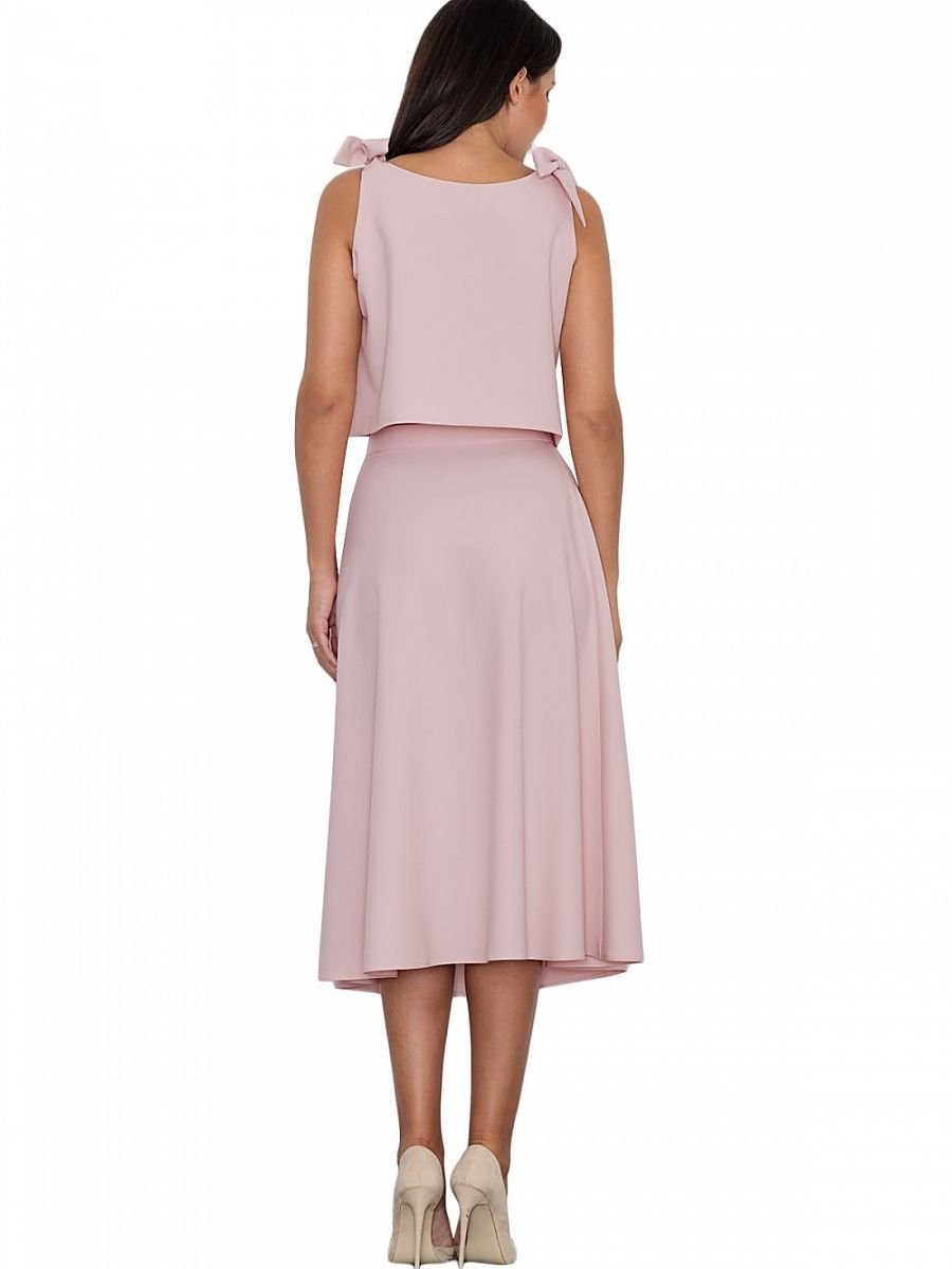 Un ensemble élégant avec une jupe. La grande coupe de la jupe ajoute au confort quotidien. Droit, évasé à mi-mollet, avec une fermeture éclair dissimulée au dos. Top ample avec nœuds décoratifs, noué aux épaules. Le tout pour ceux qui aiment avoir un look à la mode et moderne.
