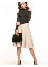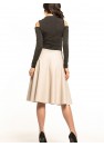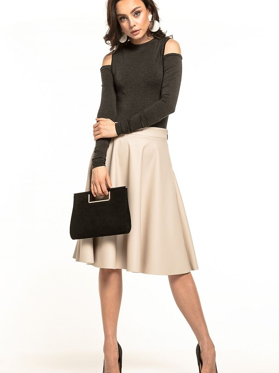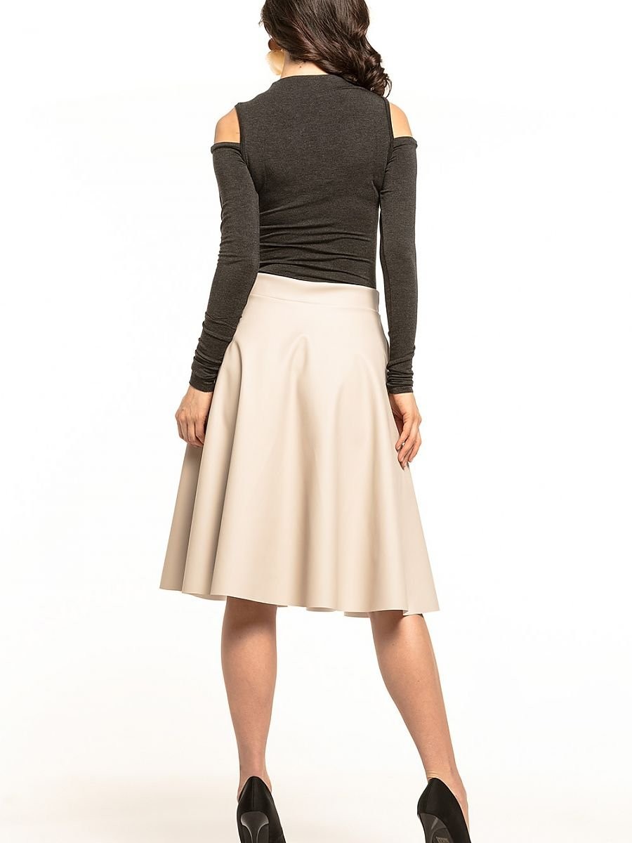 Élégante jupe midi évasée en cuir écologique. Cette jupe possède une fermeture éclair décorative sur le côté.
