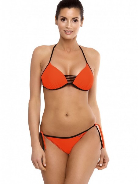 Un séduisant maillot de bain deux pièces de style bikini. Il est doté de bonnets lisses, remplis de mousse push-up en dessous, ce qui donne l'impression que les seins sont plus rapprochés, soulevés et agrandis. Le push-up existe dans toutes les tailles et n'est pas détachable du modèle. Au milieu du soutien-gorge - des bretelles en caoutchouc noir à la mode. Les garnitures contrastées ajoutent du caractère et mettent joliment en valeur votre bronzage. Superbe culotte nouée des deux côtés - grâce à elle, vous pouvez ajuster la taille du bas à vos besoins. Ce tissu italien de haute qualité, disponible dans une douzaine de couleurs, est tout simplement phénoménal sur la plage (et vous serez féminine et sexy). Les bretelles et la circonférence du soutien-gorge sont confortablement attachées.