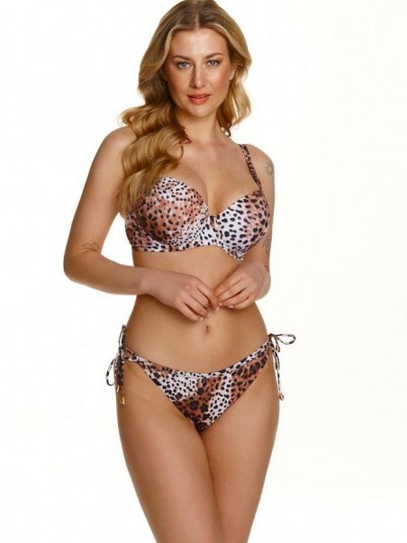 Le soutien-gorge de bain de la dernière collection de maillots de bain avec l'imprimé léopard est un must have de la saison. Une ligne créée pour les femmes qui n'aiment pas s'ennuyer et qui cherchent des solutions pour mettre en valeur leur caractère, leur tempérament et leur style affirmé. Les bonnets à armatures avec insert push-up en gel rassemblent et accentuent parfaitement la poitrine. Une décoration subtile entre les bonnets. Sans bretelles, bretelles réglables. Modèle conçu pour les petites et moyennes poitrines.