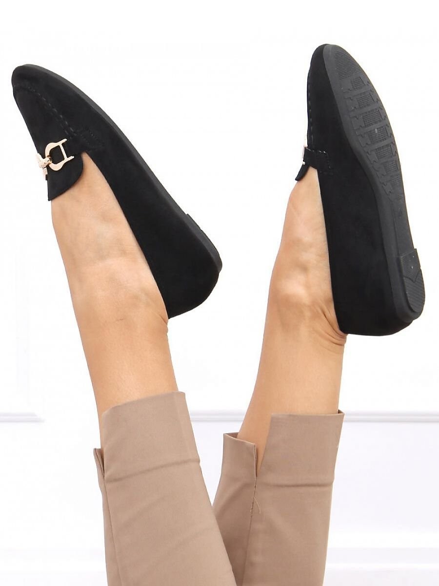 Mocassins en daim pour femmes. La combinaison d'une coupe classique avec un ornement stylé et doré donne le meilleur effet : ) Ce modèle unique est doté d'un nez confortable et arrondi et d'une semelle intérieure souple et matelassée - que demander de plus ? : ) Matériau extérieur - daim écologique.