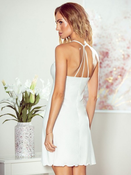 Belle nuisette avec une encolure en dentelle, décorée d'une petite broche avec des zircons. Extrêmement séduisante, féminine et élégante. Dos avec de fines bretelles qui créent un bel effet, cousues sous la poitrine. Tissu souple et élastique de haute qualité. Une des meilleures chemises de nuit de la nouvelle collection de la marque Eldar.