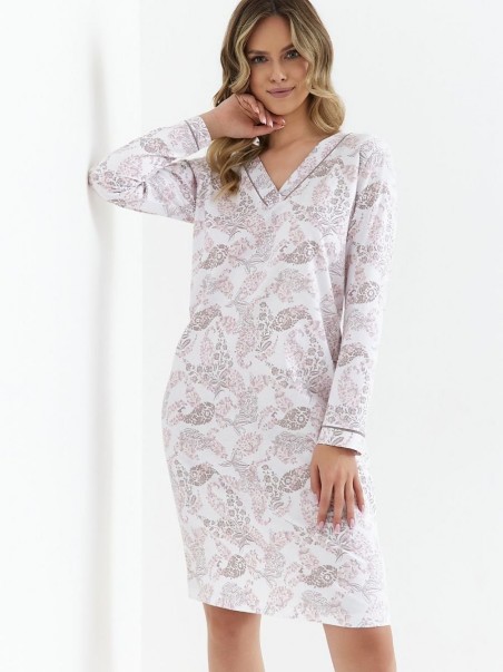 Cette chemise de nuit au design élégant et à l'encolure en pointe est le choix parfait pour une nuit de sommeil confortable et élégante. Sa longueur sous le genou offre une couverture idéale, tandis que sa coupe ample et confortable vous permet de bouger librement. La chemise est fabriquée dans un tissu doux et aéré, avec un imprimé subtil qui ajoute à son charme et garantit une nuit de sommeil confortable. Des passepoils élégants ajoutent une touche unique. Les manches longues apportent une chaleur supplémentaire lors des nuits plus fraîches. La chemise est emballée dans une élégante pochette, ce qui en fait un cadeau idéal ou un ajout élégant à votre garde-robe personnelle.