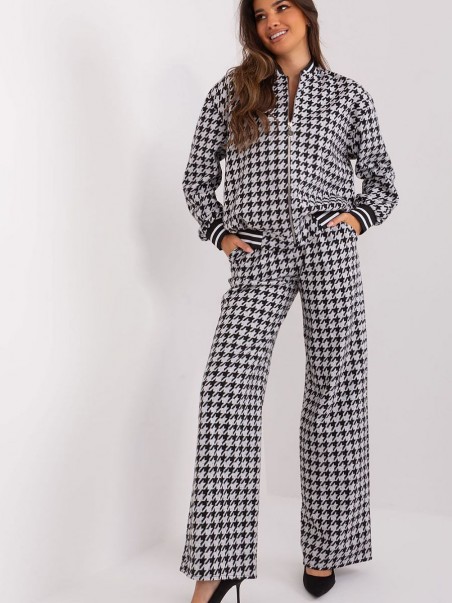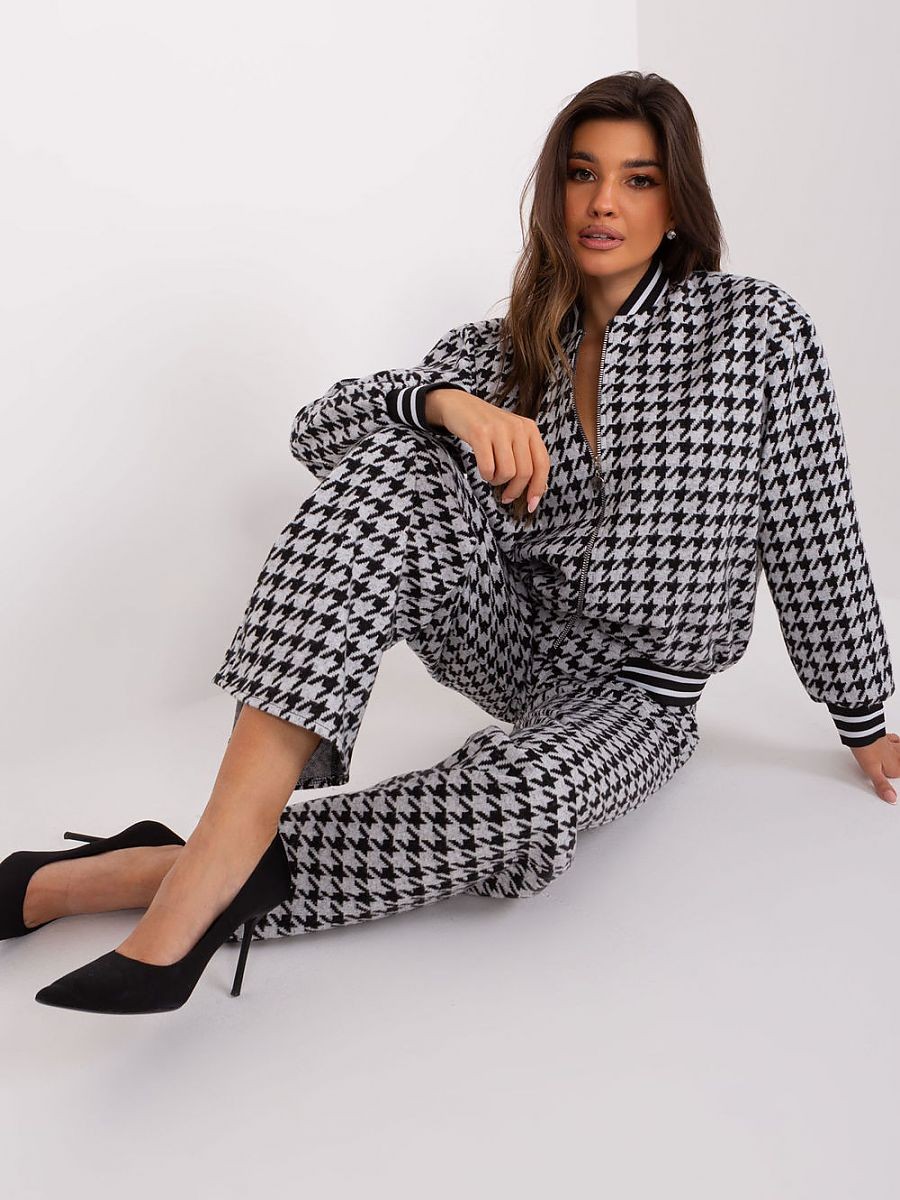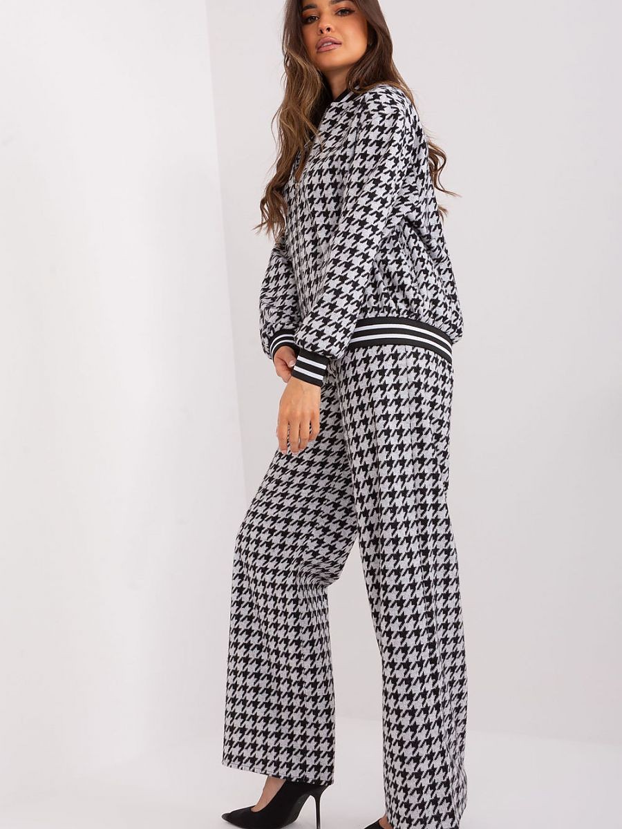 Un ensemble décontracté composé d'un sweat-shirt et d'un pantalon. Le sweatshirt zippé, le col montant et les poches à glissière sont la combinaison parfaite du confort et du style décontracté, parfaits pour une variété d'occasions, des activités quotidiennes aux journées de travail. Fabriqué principalement en coton, le sweat-shirt offre une sensation agréable sur la peau tout en étant facile d'entretien. Le col montant ajoute une touche de modernité au sweat, tout en protégeant du froid les jours les plus froids. La fermeture à glissière permet d'enfiler et d'enlever facilement le sweat, ce qui le rend pratique et facile à utiliser. Les poches à glissière sont à la fois pratiques et élégantes, car elles permettent de ranger de petits objets ou de garder les mains au chaud. Le pantalon à jambe large et à taille haute est le complément idéal d'un ensemble décontracté. Grâce à sa coupe confortable, ce pantalon est idéal pour les activités quotidiennes comme pour les journées de travail, car il garantit une grande liberté de mouvement. Les poches à glissière sont pratiques et permettent de ranger de petits objets. Le motif géométrique dominant ajoute une touche unique à l'ensemble, soulignant le style individuel de la personne qui le porte. Cette élégante combinaison de sweat-shirt et de pantalon rend cet ensemble non seulement confortable, mais également à la mode et élégant. Grâce à son style décontracté, cet ensemble convient aux sorties quotidiennes, au travail et aux jours plus froids, lorsque le confort va de pair avec un look à la mode. Cet ensemble est destiné aux femmes qui apprécient à la fois le côté pratique, le confort et le style.