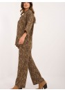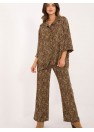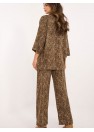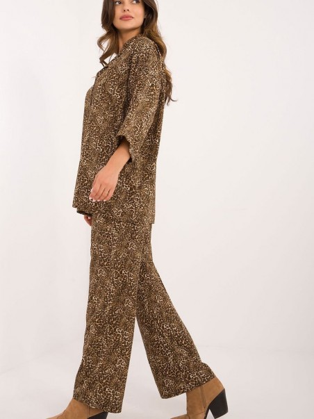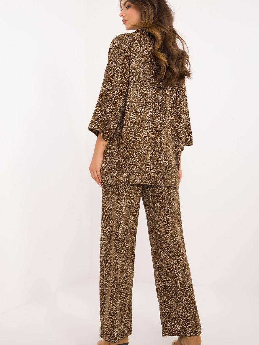 Ensemble composé d'une chemise et d'un pantalon, parfait pour les occasions quotidiennes décontractées. La chemise est boutonnée, avec des manches 3/4 et un col classique, ce qui lui donne un caractère universel. Un avantage supplémentaire est la poche pratique à hauteur de la poitrine. Le pantalon a des jambes larges, ce qui assure confort et liberté de mouvement, et grâce à une bande élastique à la taille, il s'adapte parfaitement à la silhouette, offrant un confort de port tout au long de la journée. L'ensemble est fait d'un mélange de polyester et d'élasthanne, ce qui garantit légèreté, élasticité et durabilité du matériau. Le motif animalier est dominant, ce qui ajoute une touche de style et de caractère à l'ensemble. La chemise et le pantalon sont longs, et le pantalon a une taille haute, ce qui met en valeur la silhouette et ajoute de l'élégance aux styles de tous les jours.