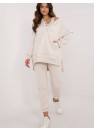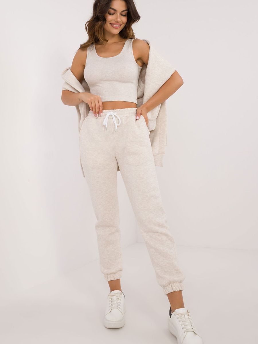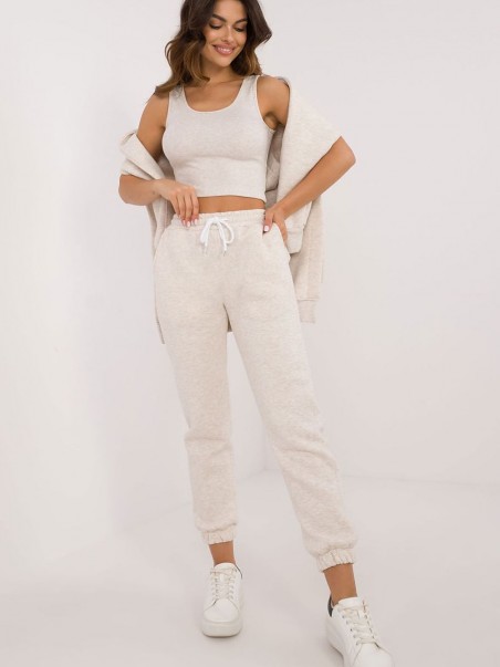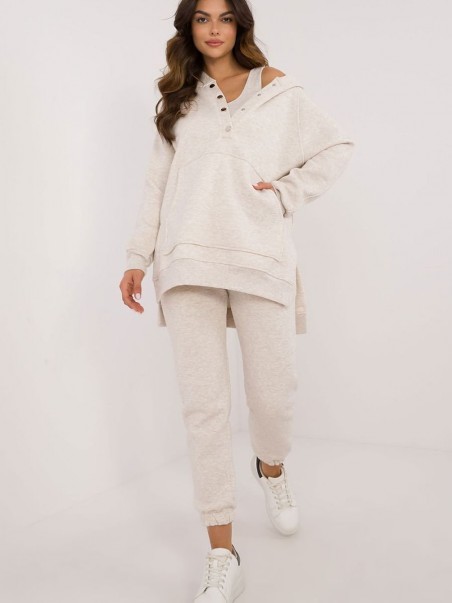 Un ensemble isolé de style décontracté pour femmes, idéal pour les jours plus froids et les sorties quotidiennes, composé d'un T-shirt, d'un sweat-shirt et d'un pantalon. L'ensemble se distingue par un motif mélangé qui apporte une touche unique. Fabriqué principalement en coton, il apporte confort et chaleur, idéal pour les journées d'automne et d'hiver. Le pantalon a des jambes longues avec des bordures côtelées et une taille haute qui souligne la silhouette et garantit une coupe confortable. La taille est dotée d'un cordon de serrage pour un ajustement parfait, et les poches latérales sont une solution pratique pour les petits objets. Le sweat à manches longues se ferme à mi-hauteur par des boutons-pression, ce qui ajoute de l'originalité et facilite l'enfilage. Il est également doté d'une capuche et d'une grande poche kangourou, qui apportent une touche sportive et une fonctionnalité supplémentaire. Il est complété par un tee-shirt classique, créant ainsi un ensemble confortable et élégant, idéal pour un style quotidien lors des journées plus froides.