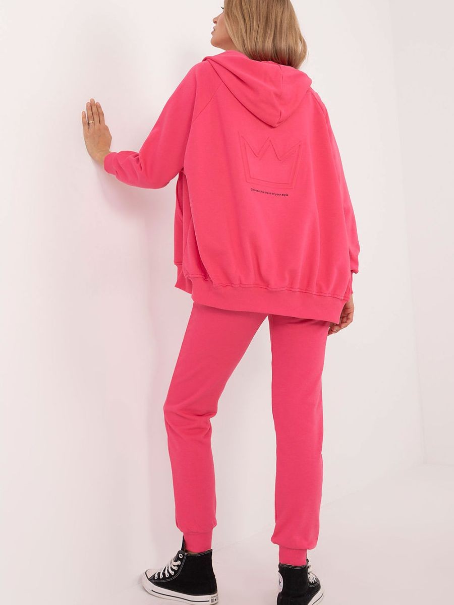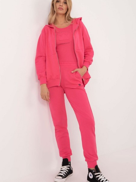 Ensemble de survêtement pour femme dans un style décontracté, idéal à la fois pour les sorties quotidiennes et les activités sportives, composé d'un t-shirt, d'un sweat à capuche et d'un pantalon. L'ensemble a un motif lisse, ce qui lui confère un caractère universel, et le matériau dominant est un mélange doux et résistant de coton et de polyester, offrant confort et respirabilité. Le pantalon a des jambes longues avec des poignets élastiques et une taille haute, soulignant la silhouette et offrant une liberté de mouvement totale. Il y a une bande élastique à la taille pour un ajustement parfait. De plus, les pantalons ont des poches latérales pratiques et fonctionnelles. Le sweat à capuche à manches longues, fermé par une fermeture éclair, est équipé de poches latérales et d'une capuche, ajoutant un style sportif et offrant une protection contre le froid. Le t-shirt à encolure ronde classique est l'accessoire parfait pour compléter l'ensemble. Cet ensemble est un mélange de confort, fonctionnalité et style, idéal pour tous les jours et les activités sportives.