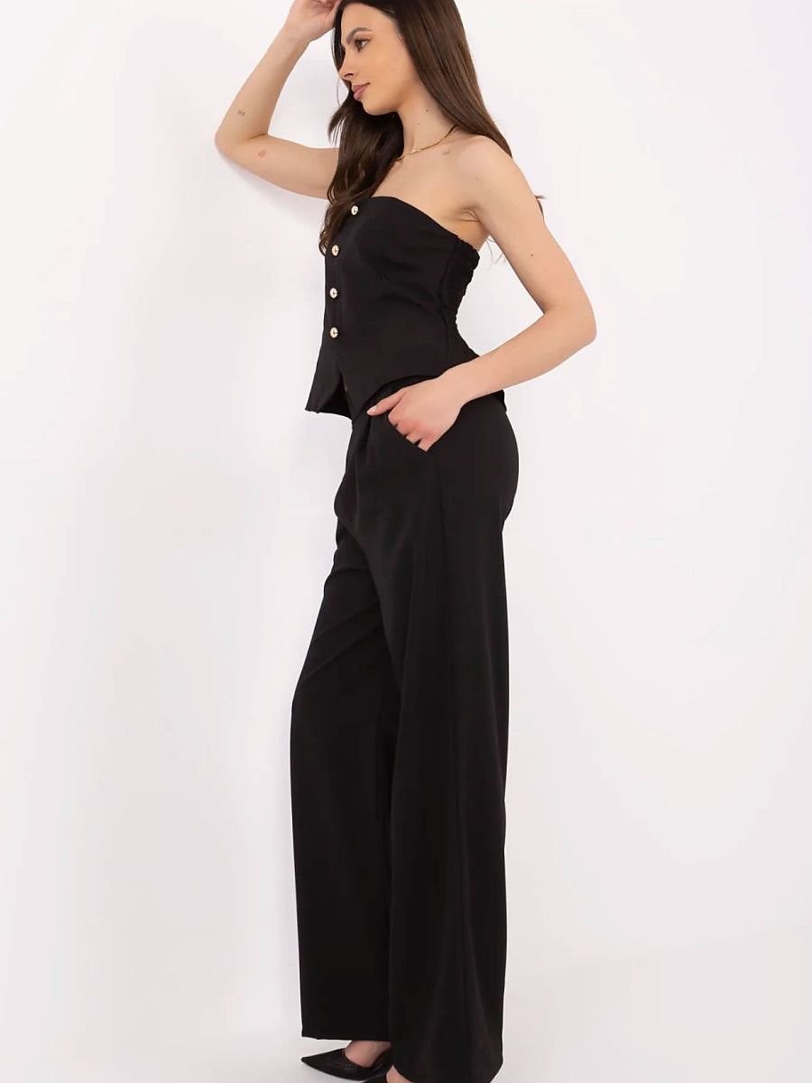 Un ensemble stylé pour femmes, composé d'un gilet et d'un pantalon, est un excellent choix pour les femmes qui apprécient l'élégance avec une touche de modernité. Idéal pour le quotidien, le travail, les occasions formelles ou les soirées, il convient partout où le style et le confort sont essentiels. Le gilet sans manches, avec un décolleté espagnol, est ornée de boutons décoratifs à l'avant et de plis tape-à-l'œil dans le dos, qui donnent à la silhouette une légèreté subtile et mettent en valeur la ligne féminine. Le pantalon à taille haute et à jambes larges allonge visuellement les jambes et se déplace magnifiquement. Les poches latérales insérées ajoutent de la fonctionnalité tout en conservant le caractère élégant de l'ensemble. Fabriqué à partir d'un matériau lisse, alliant polyester et élasthanne, cet ensemble garantit confort et style tout au long de la journée.